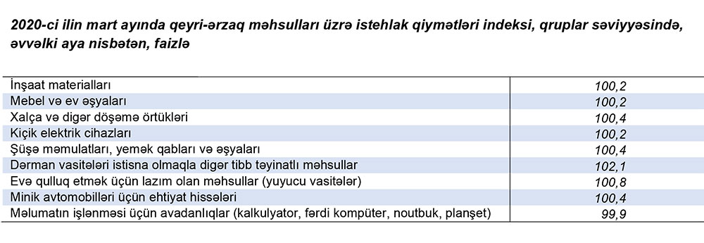 2020-ci ilin mart ayında qeyri-ərzaq məhsulları üzrə istehlak qiymətləri indeksi əvvəlki aya nisbətən 0,2 faiz, əvvəlki ilin mart ayına nisbətən 1,2 faiz təşkil edib.