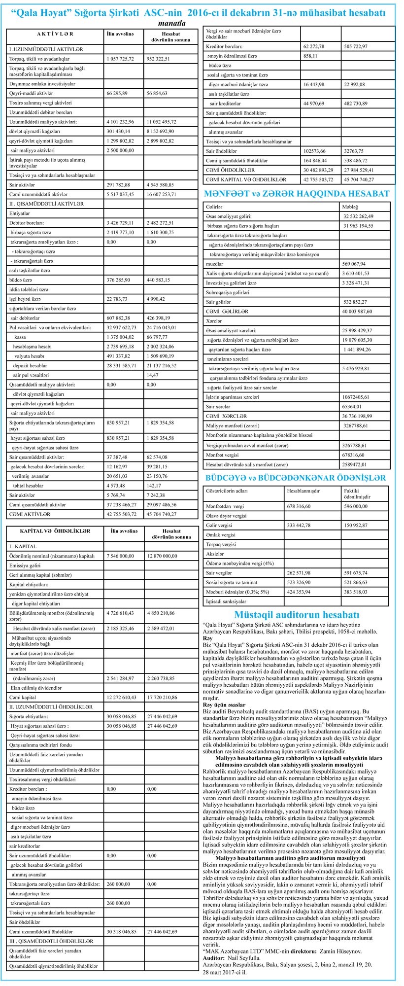 “Qala Həyat Sığorta” şirkəti 2016-cı ili 2 milyon 589 min manat xalis mənfəət ilə başa vurub.