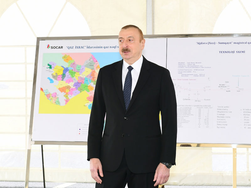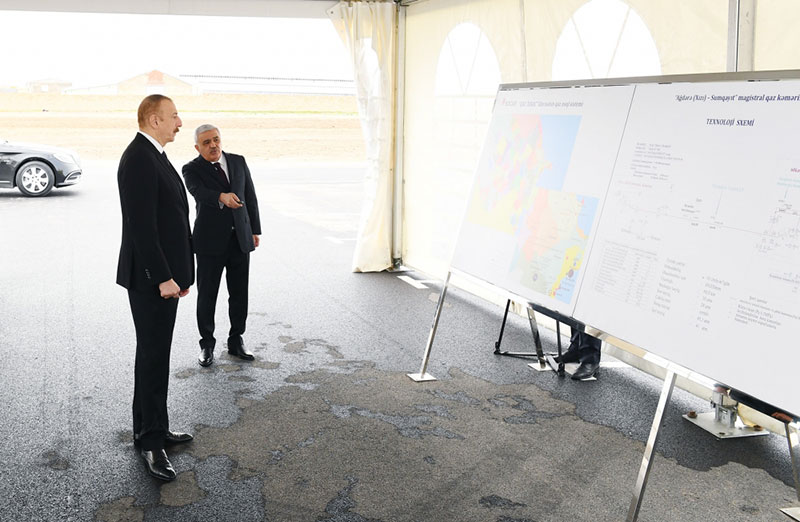 -Bu gün Sumqayıt şəhərinin dayanıqlı qaz təchizatı işində çox əlamətdar bir gündür. Biz Sumqayıt şəhərinə yeni alternativ qaz xəttinin çəkilişini qeyd edirik. Bu münasibətlə bütün sumqayıtlıları təbrik etmək istəyirəm. Çünki bu, şəhəri dayanıqlı qazla təmin etmək üçün imkanlar yaradır və eyni zamanda, şəhərin gələcək potensialını da nəzərə alır. Bu vaxta qədər Sumqayıt bir xətt üzərində qazla təmin edilirdi. Əlbəttə ki, Sumqayıtda son illərdə yaradılmış sənaye müəssisələri, sənaye klasterləri əlavə həcm tələb edirdi. Bunu nəzərə alaraq yeni qaz kəmərinin tikintisi zəruri idi. Qaz kəmərinin uzunluğu 60 kilometrdir. Bu, böyük bir inşaat layihəsi olubdur. Qısa müddət ərzində bu kəmər istifadəyə verilir və bu gün artıq fəaliyyətə başlayır.