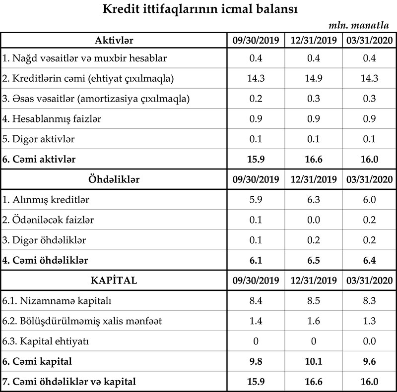 Bu il aprelin 1-nə BOKT-ların aktivləri 349,4 milyon manat olub ki, bunun da 246,2 milyon manatı müştərilərə verilmiş xalis kreditlərdir. Martın sonuna BOKT-lar 208,4 milyon manat öhdəliklərə, 141 milyon manat balans kapitalına malik olub.
