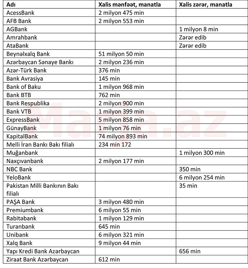 Belə ki, 177 milyon 388 min manat xalis mənfəətin 141 milyon 367 min manatı və ya 80%-i 5 bankın, 36 milyon 21 min manatı və ya 20%-i 17 bankın payına düşüb. Eyni zamanda 8 bank zərərdədir.