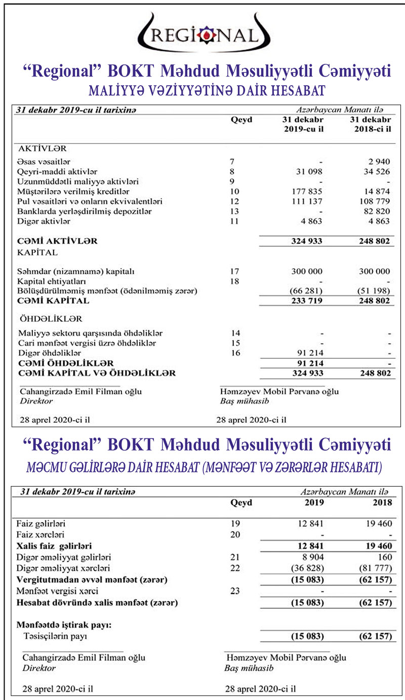 “Regional” BOKT MMC 2019-cu ili 15 min 83 manat zərər ilə başa vurub. 2018-ci illə müqayisədə MMC-nin zərəri 4 dəfə azalıb.