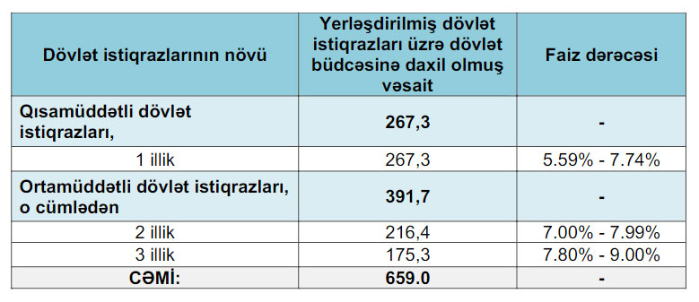 2019-cu il ərzindədaxili maliyyə bazarında yerləşdirilmiş dövlət istiqrazları üzrə dövlət büdcəsinə 659 milyon manat vəsait daxil olmuşdur.