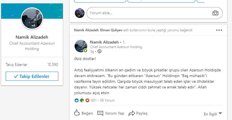 Marja xəbər verir ki, holdinqin yeni baş mühasibi Namiq Əlizadədir. Bu barədə Namiq Əlizadə şəxsi Linkedin səhifəsində məlumat verib.