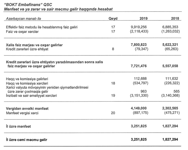 Xalis mənfəətin artması “Embafinans”ın gəlirlərinin artmasından qaynaqlanır. 2019-cu ildə 2018-ci illə müqayisədə təşkilatın faiz gəlirləri 3 milyon 34 min manat və ya 44% artaraq 9 milyon 919 min manat təşkil edib.
