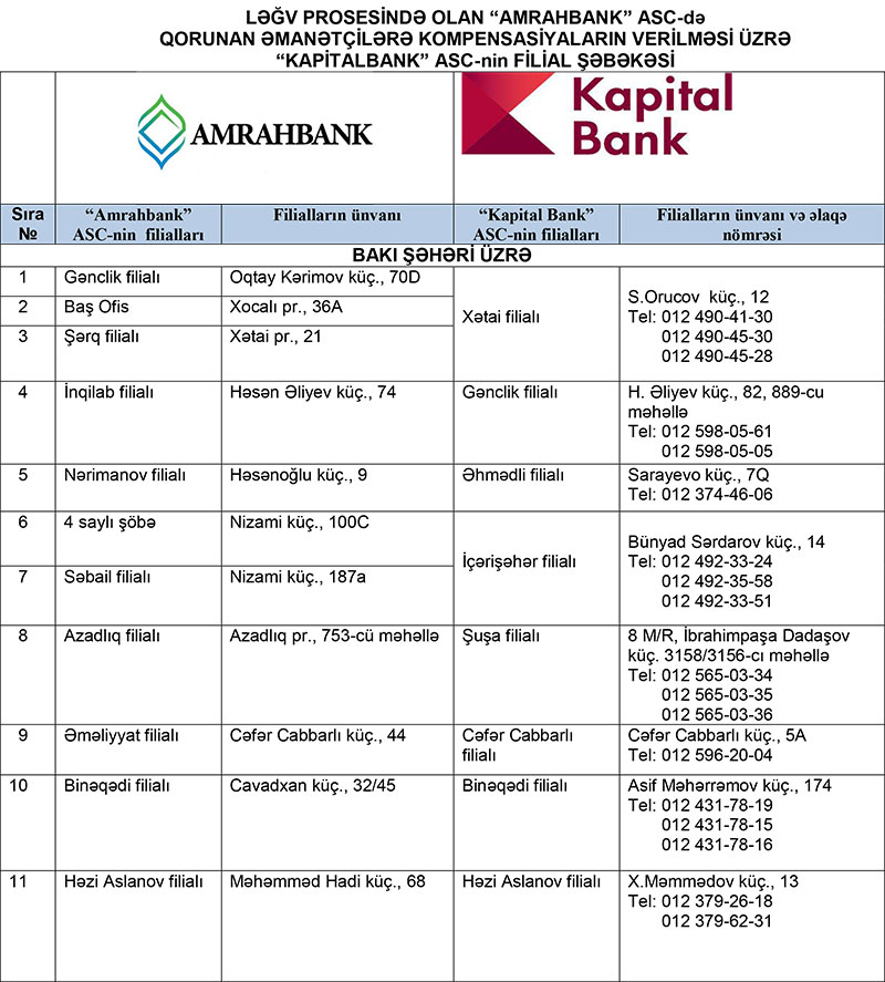 Əlavə olunan cədvələ uyğun olaraq qorunan əmanətçilər ləğv prosesində olan “Atabank” ASC və “Amrahbank” ASC-də əmanətləri olduğu filialın qarşısında qeyd edilən “KapitalBank” ASC-nin filialına müraciət edərək yuxarıda qeyd edilən sənədlər əsasında kompensasiyalarını əldə edə bilərlər.