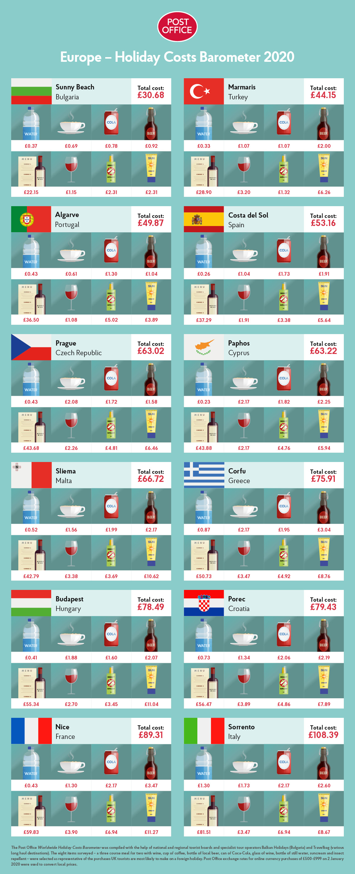 Böyük Britaniyanın "Post Office" təşkilatı, 42 ölkədə 8 turizm xərci üzrə araşdırma apararaq 2020-ci ildə Avropanın ən ucuz ölkələrini müəyyən edib.