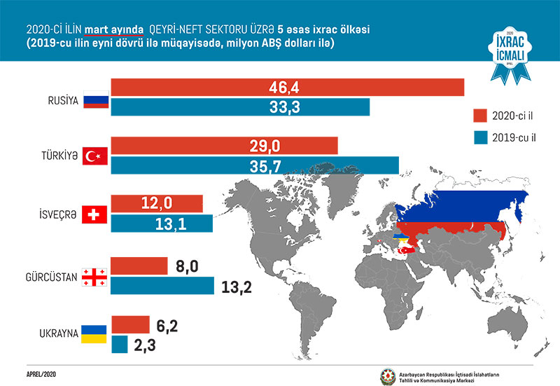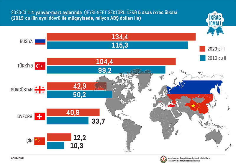 2019-cu ilin müvafiq dövrü ilə müqayisədə 2020-cu ilin ilk 4 ayı ərzində Rusiyaya qeyri-neft ixracı 13 faiz, İsveçrəyə 9 faiz və Çinə 45 faiz artıb.