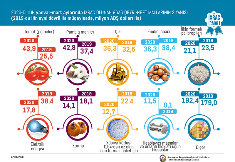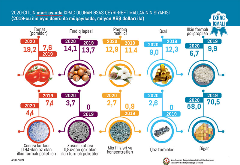 2020-ci ilin yanvar-aprel ayları ərzində ixrac edilən qeyri-neft sektoruna aid malların siyahısında isə pomidor (73,3 milyon ABŞ dolları) birinci, pambıq mahlıcı (44,3 milyon ABŞ dolları) ikinci və qızıl (sikkə kəsilməsində istifadə olunmayan, digər emal olunmamış formalarda – 43,7 milyon ABŞ dolları) üçüncü olub.
