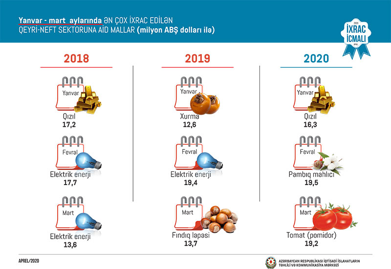 İcmalda bildirilib ki, 2020-ci ilin yanvar-aprel ayları ərzində Azərbaycandan qeyri-neft sektoru üzrə 549 milyon ABŞ dolları dəyərində ixrac reallaşdırılıb. 2019-cu ilin müvafiq dövrü ilə müqayisədə 2020-ci ilin yanvar-aprel ayları ərzində koronavirus (COVID-19) pandemiyasının təsiri nəticəsində qeyri-neft sektoru üzrə ixrac 5,8 faiz azalıb.
