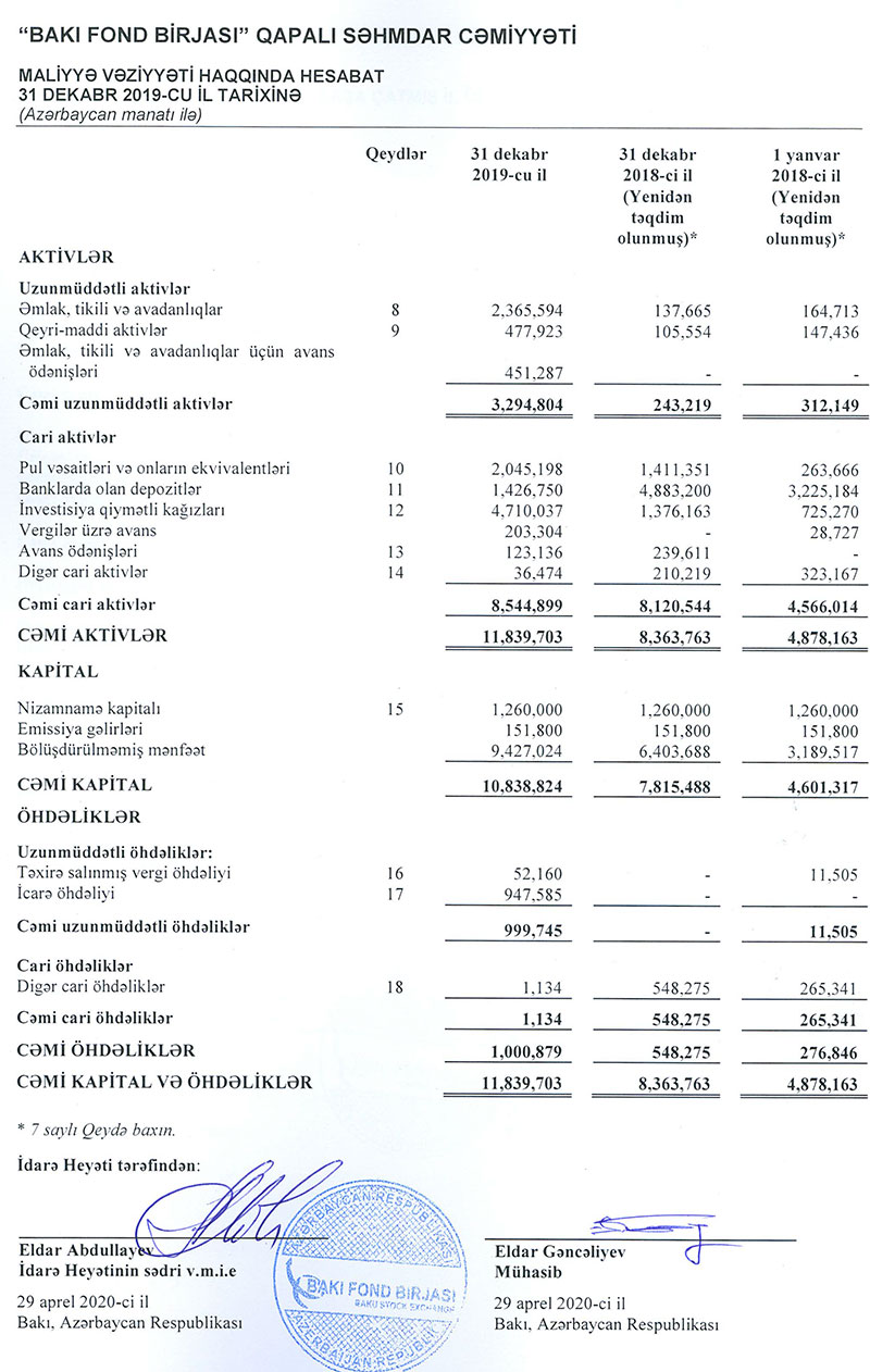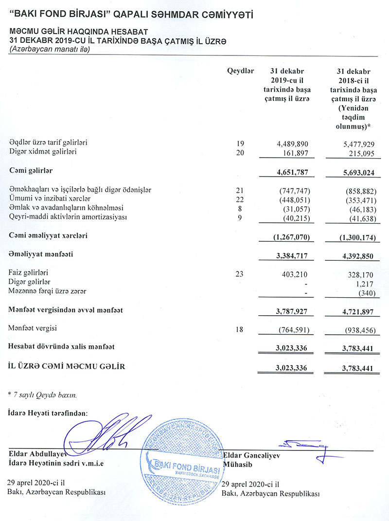Bakı Fond Birjası 2019-cu ili 3 milyon 23 min manat xalis mənfəət ilə başa vurub.