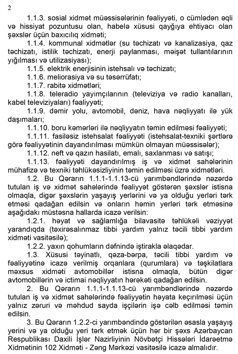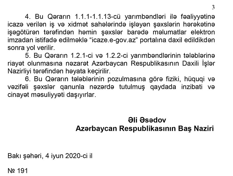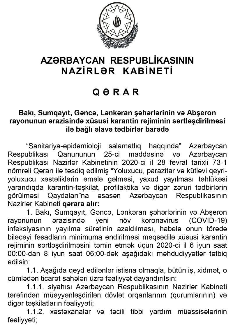 Qeyd ediib ki, Bununla əladədar olaraq, 2020-ci il 6 iyun saat 00:00-dan 8 iyun saat 06:00-dək Bakı, Sumqayıt, Gəncə, Lənkəran şəhərlərinin və Abşeron rayonunun ərazisində bütün iş, xidmət və ticarət sahələri üzrə fəaliyyət, eyni zamanda ictimai nəqliyyatın və avtomobillərin hərəkəti dayandırılacaq (xüsusi təyinatlı, qəza-bərpa, təcili tibbi yardım avtomobillərinin və fəaliyyətinə icazə verilən orqanların (qurumların) və təşkilatların xidməti avtomobillərinin hərəkəti istisna olmaqla).