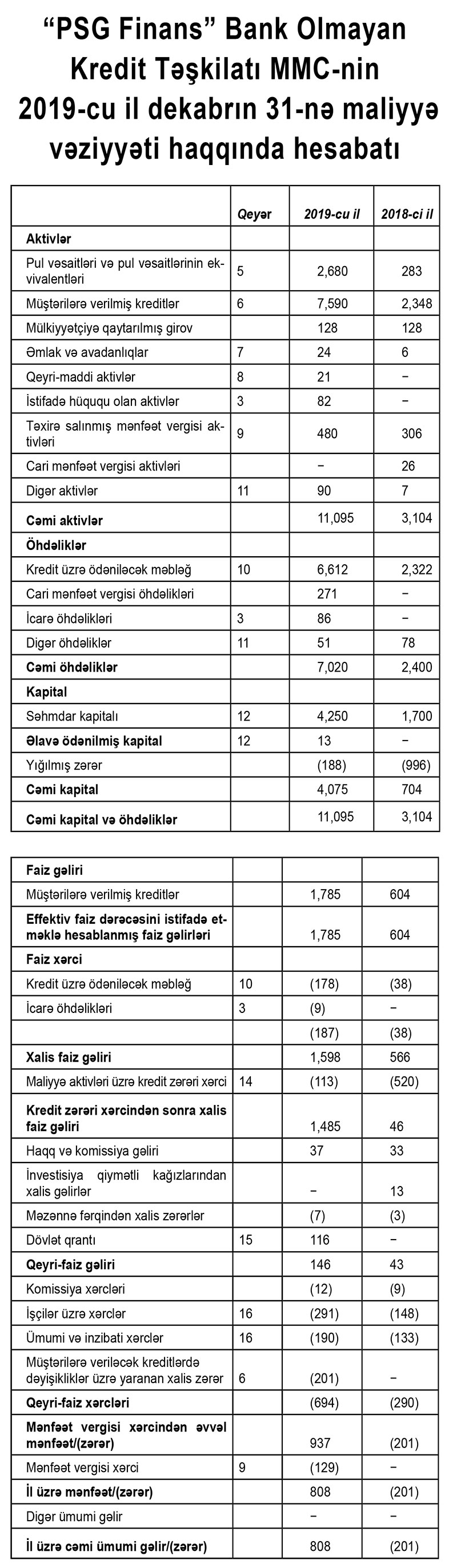"PSG Finans" MMC bank olmayan kredit təşkilatı (BOKT) 2019-cu ili 808 min manat xalis mənfəətlə başa vurub. Halbuki, BOKT 2018-ci ildən 201 min manat zərərlə çıxmışdı.