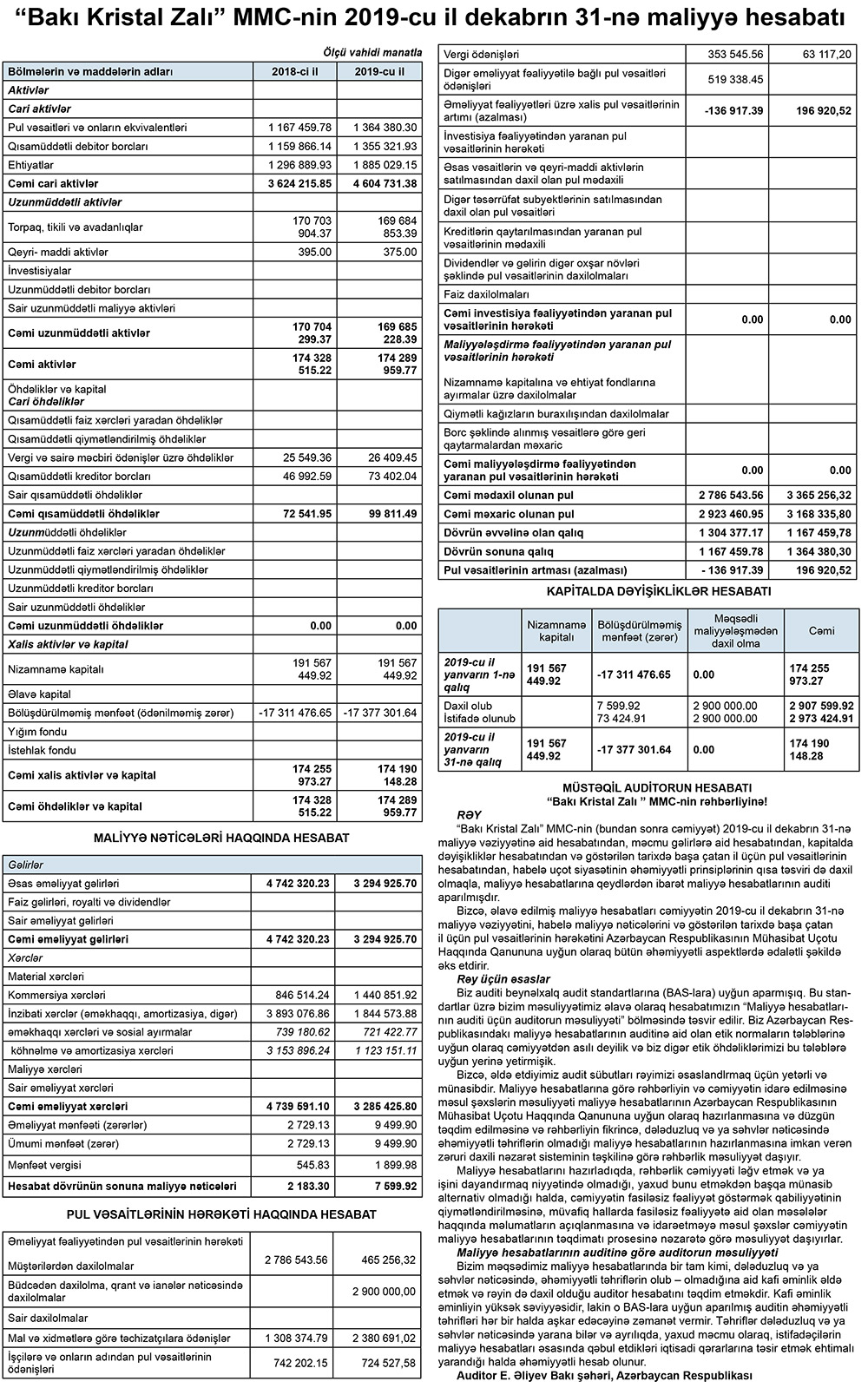 Müqayisə üçün qeyd edək ki, 2018-ci ildə “Bakı Kristal Zalı”nın cəmi əməliyyat gəlirləri 4 milyon 742 min 320 manat, cəmi əməliyyat xərcləri 4 milyon 739 min 591 manat, əməliyyat mənfəəti 2729 manat, mənfəət vergisi ödəməsi 546 manat təşkil etmişdi.