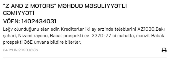 Marja şirkətin bildirişinə istinadən xəbər verir ki, kreditorlar iki ay ərzində tələblərini AZ1030, Bakı şəhəri, Nizami rayonu, Babək prospekti ev 2270-77 ci məhəllə, mənzil Babək prospekti 36E ünvana bildirə bilərlər. Bu ünvanda ZZ Motors adlı avtomobil ehtiyyat hissələrinin satışı mərkəzi fəaliyyət göstərir.