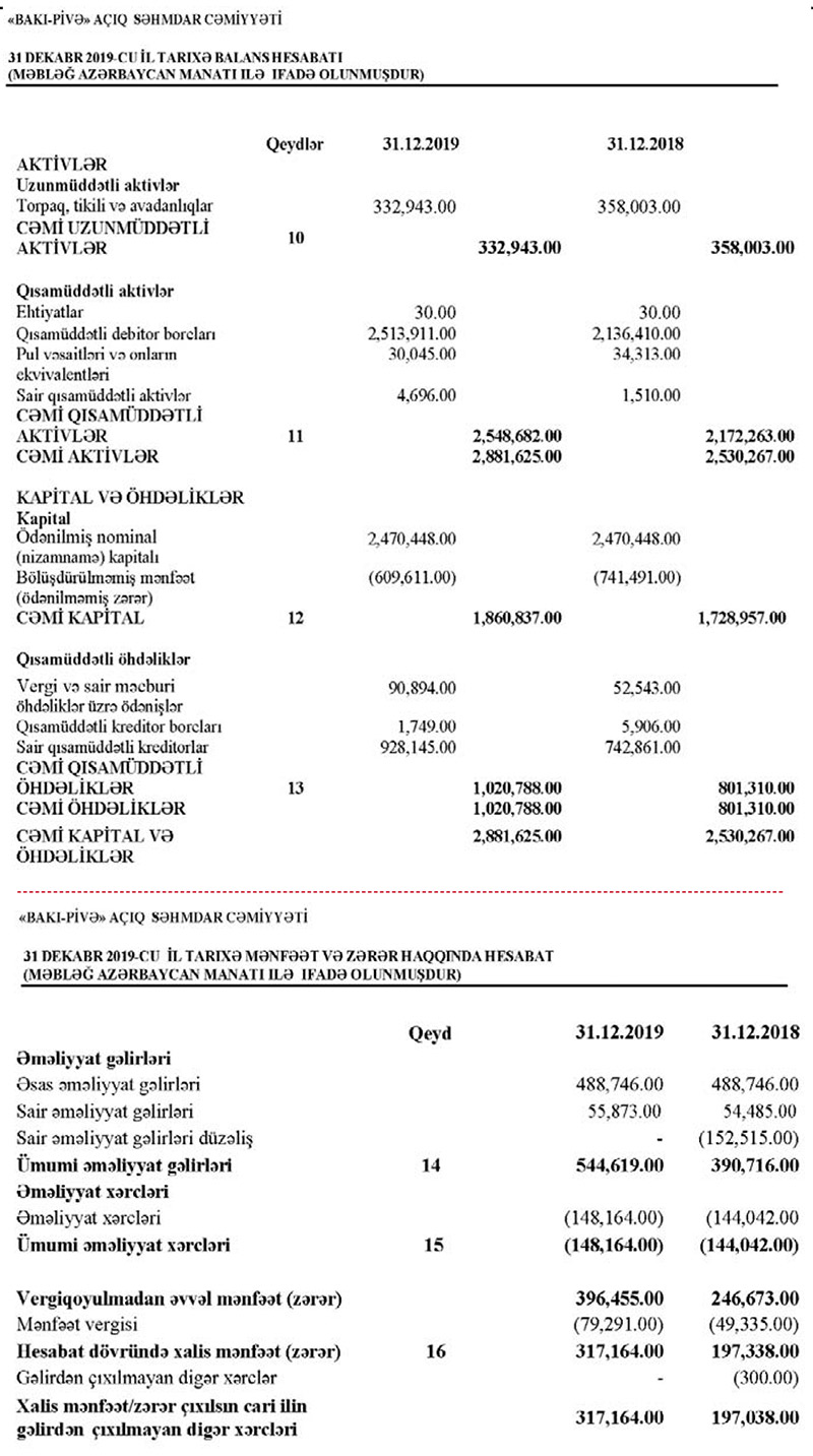 Ötən il “Bakı Pivə”nin cəmi gəlirləri 544 min 619 manat, cəmi xərcləri isə 227 min 455 manat təşkil edib.