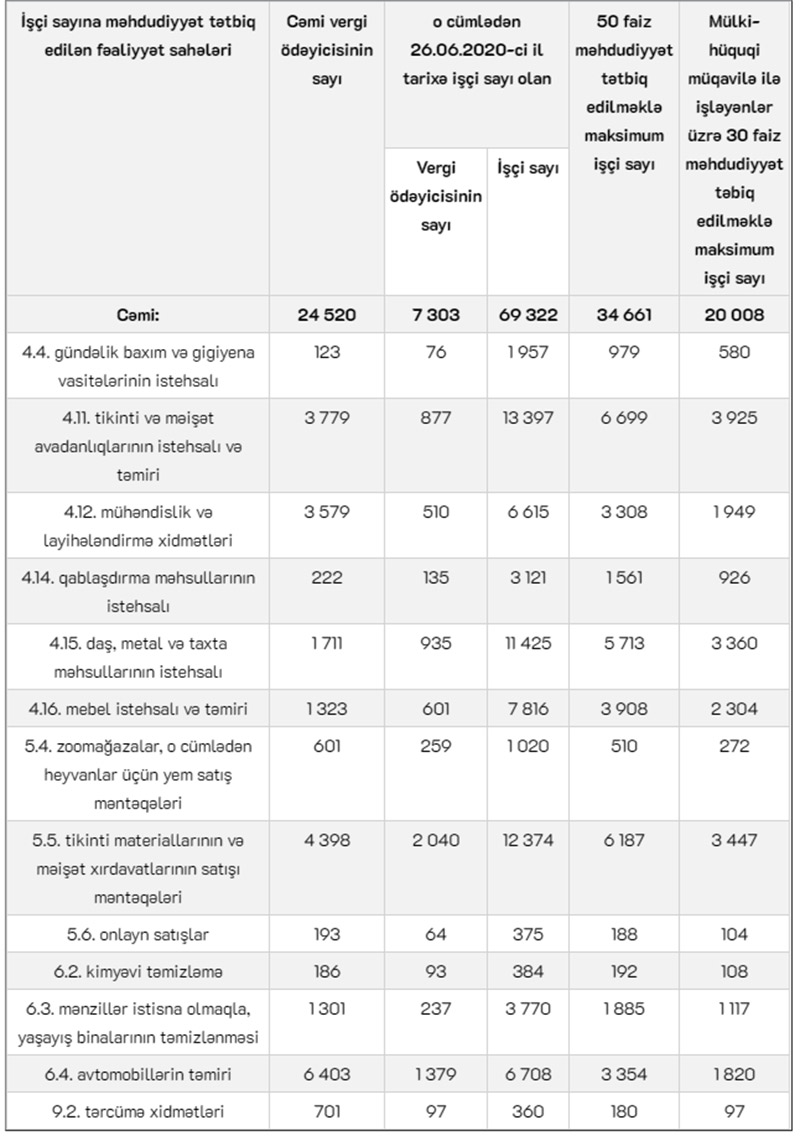Aşağıdakı cədvəldə həmin fəaliyyət sahələri, orada çalışan vergi ödəyiciləri, onların işçi sayı və tətbiq edilən məhdudiyyətlərlə bağlı məlumatlarla tanış ola bilərsiniz.