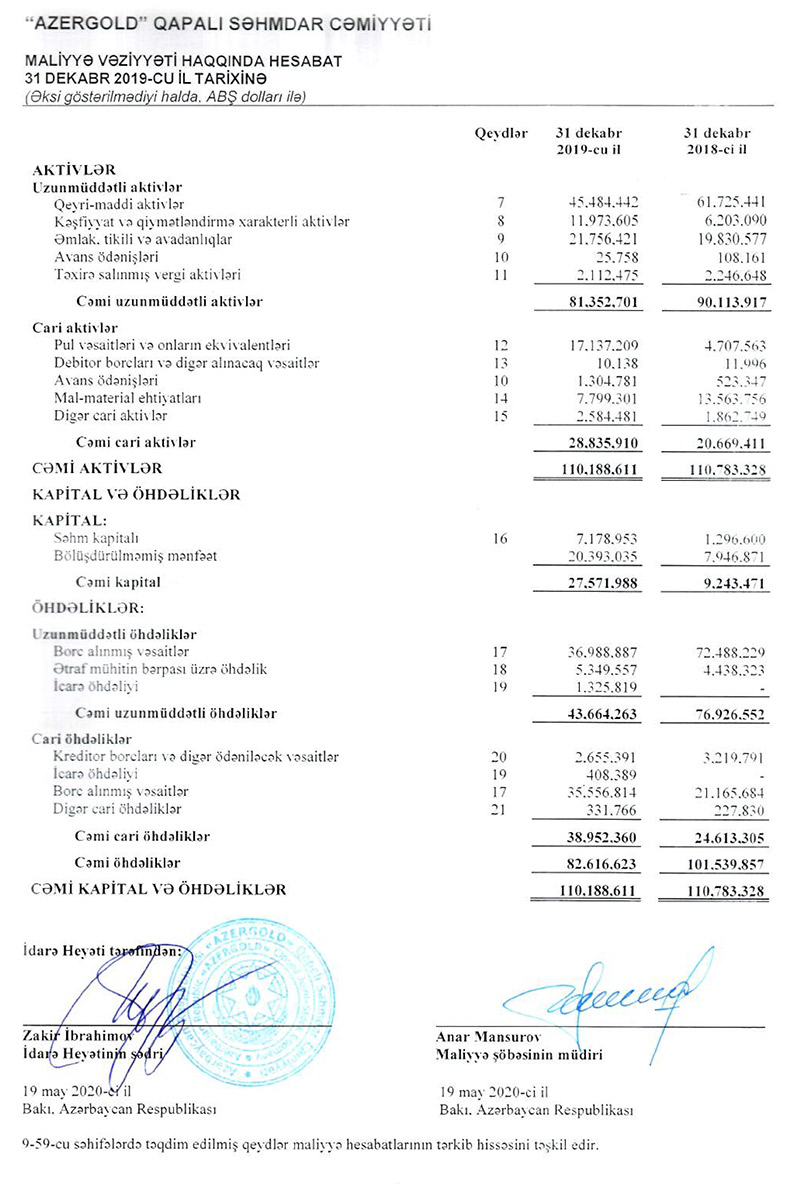 “AzerGold” QSC-in 2019-cu il üzrə maliyyə hesabatlarına kənar auditor olaraq “Baker Tilly Azerbaijan” QSC rəy vermişdir.