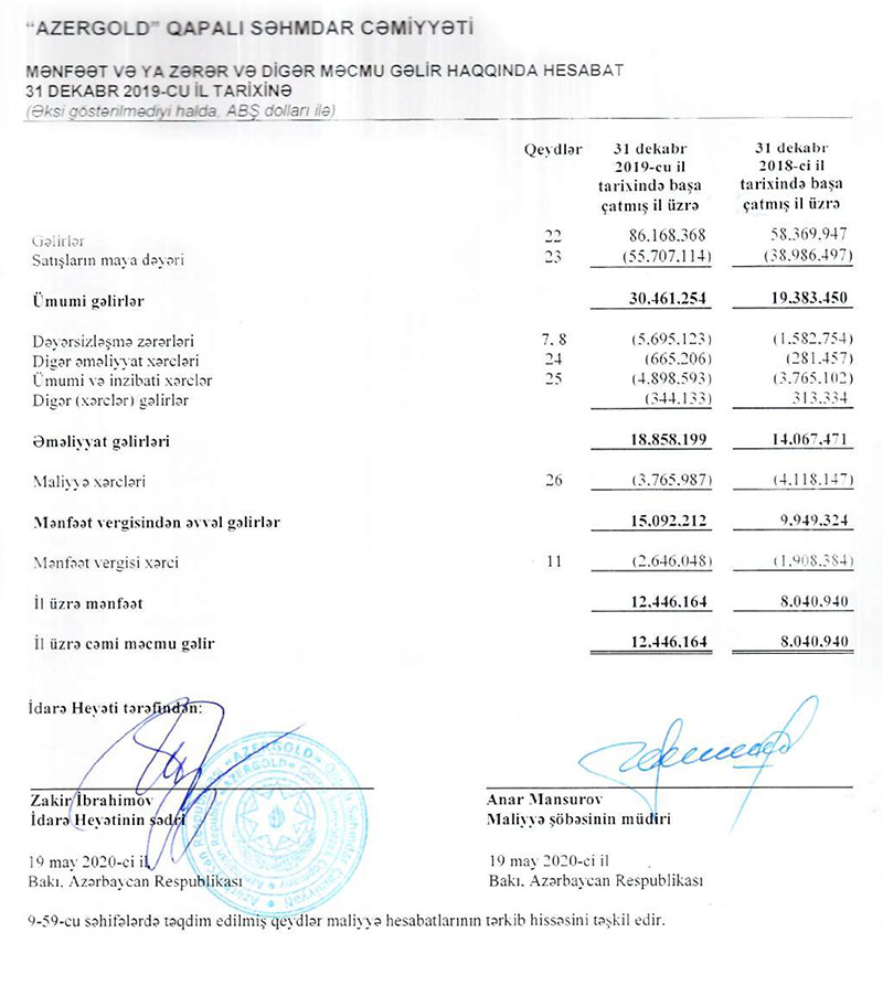 "Ümumilikdə, 2019-cu ildə 2018-ci illə müqayisədə Cəmiyyətin qızıl hasilatında 21.4 %, gümüş hasilatında isə 33.3 % artım qeydə alınmışdır. QSC-nin maliyyə hesabatlarında qeyd edildiyi kimi, hesabat ili ərzində dünya bazarlarında qızıl və gümüşün qiymətinin artması fonunda qiymətli metalların satışından ölkə iqtisadiyyatına 86.2 milyon ABŞ dolları həcmində vəsait cəlb edilmişdir ki, bu da 2018-ci illə müqayisədə 48% (27.8 milyon ABŞ dolları) daha çoxdur. Nəticədə, Qapalı Səhmdar Cəmiyyətinin xalis mənfəəti 2018-ci illə müqayisədə 55% həcmində artaraq 12.4 milyon ABŞ dolları təşkil etmişdir".