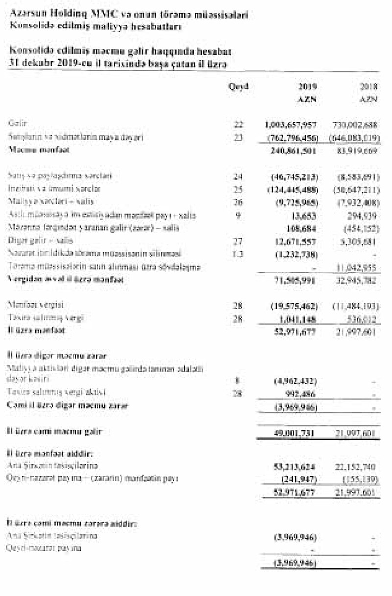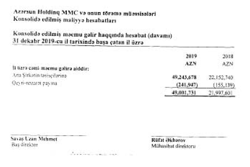 Marja MMC-nin və onun törəmə müəssisələrinin maliyyə hesabatına istinadən xəbər verir ki, 2018-ci illə müqayisədə 2019-cu ildə “Azərsun Holdinq”in xalis mənfəəti 2,4 artıb. Belə ki, Holdinq 2018-ci ili 21 milyon 993 min manat xalis mənfəət ilə bağlamışdı.