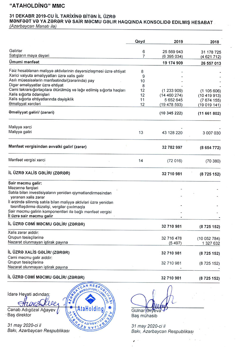 “Ata Holdinq” MMC 2019-cu ili 32 milyon 710 min manat xalis mənfəət ilə başa vurub. Halbuki, şirkət 2018-ci ili 8 milyon 725 min manat zərər ilə bağlamışdı.
