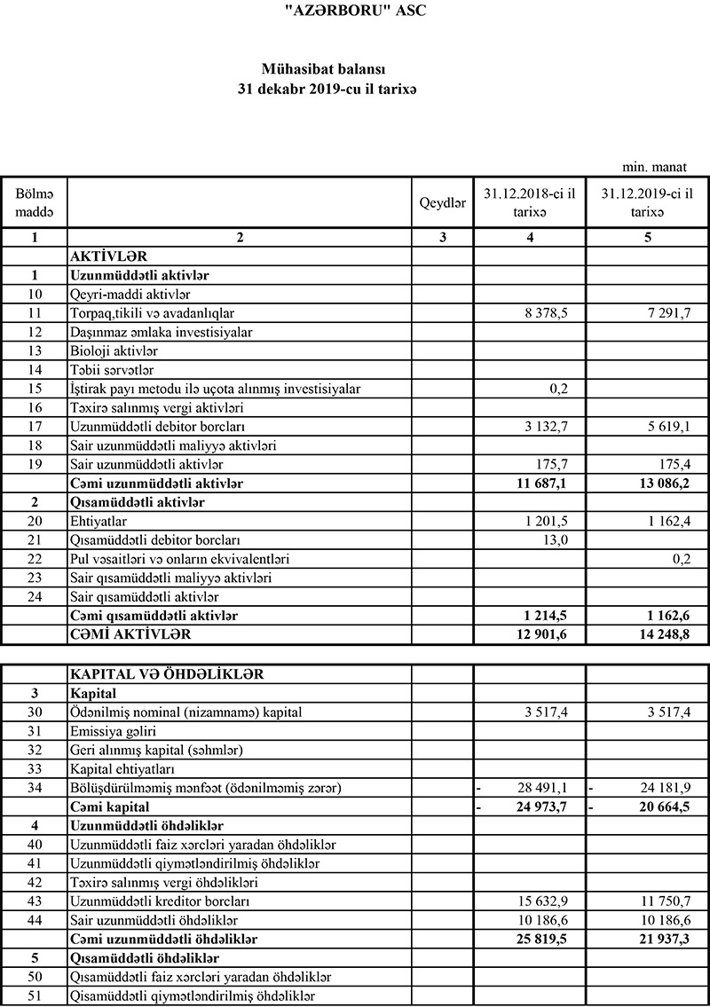 “Azərboru” ASC-nin yığılmış zərəri cəmi aktivlərini üstələyir. ASC demək olar iflasa uğrayıb.2019-cu ildə “Azərboru” ASC-nin yığılmış zərəri (ödənilməmiş zərər) 4 milyon 309 min manat azalaraq 20 milyon 664 min manata düşüb.