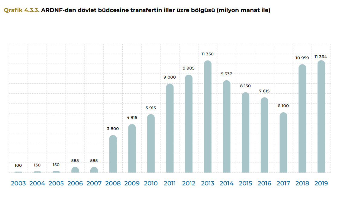 2003-2019-cu illərdə dövlət büdcəsinə ümumilikdə Azərbaycan Respublikası Dövlət Neft Fondu (ARDNF) tərəfindən 99,9 milyard manat və yaxud 99,7 milyard ABŞ dolları məbləğində vəsait köçürülmüşdür.