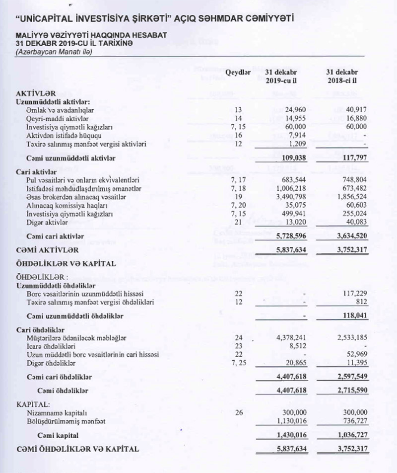 Unicapital 2019-cu ili 5 837 634 manat aktivlərlə başa çatdırıb ki, bu da əvvəlki illə müqayisədə 56% çoxdur. 2019-cu ilin sonuna Şirkətin ümumi kapitalı 1 430 016 manat təşkil edib. Ümumi kapitalın gəlirliyi isə 31.89% olub.