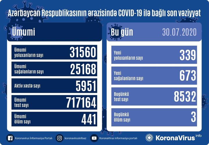 Son 24 saatda Azərbaycan Respublikasında koronavirus (COVID-19) infeksiyasına 339 yeni yoluxma faktı qeydə alınıb, 673 nəfər müalicə olunaraq sağalıb və evə buraxılıb.