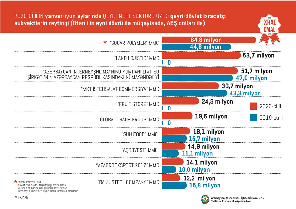 Bu ilin yanvar-iyun ayları üzrə hazırlanan qeyri-dövlət ixracatçı subyektlərin reytinqində ilk onluqda aşağıdakı şirkətlər təmsil olunurlar: “Socar Polymer” MMC, "Land Lojistic" MMC, "Azərbaycan İnterneyşnl Mayninq Kompani Limited Şirkəti"nin Azərbaycan Respublikasındakı nümayəndəliyi, "MKT İstehsalat Kommersiya" MMC, "Fruit Store" MMC, "Global Trade Group" MMC, "Sun Food" MMC, "Aqrovest" MMC, “Azagroeksport 2017” MMC, "Baku Steel Company".