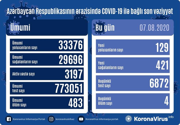 Son 24 saatda Azərbaycan Respublikasında koronavirus (COVID-19) infeksiyasına 129 yeni yoluxma faktı qeydə alınıb, 421 nəfər müalicə olunaraq sağalıb və evə buraxılıb.