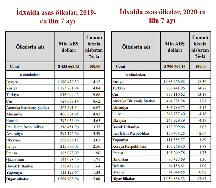 Qeyd edilən dövrdə Türkiyədən idxal 816 milyon 44 min dollardan (2019-cu ilin 7 ayında) 868 milyon 441 min dollara (2020-ci ilin 7 ayında), Çindən idxal isə 727 milyon 79 min dollardan 777 milyon 110 min dollara yüksəlib.
