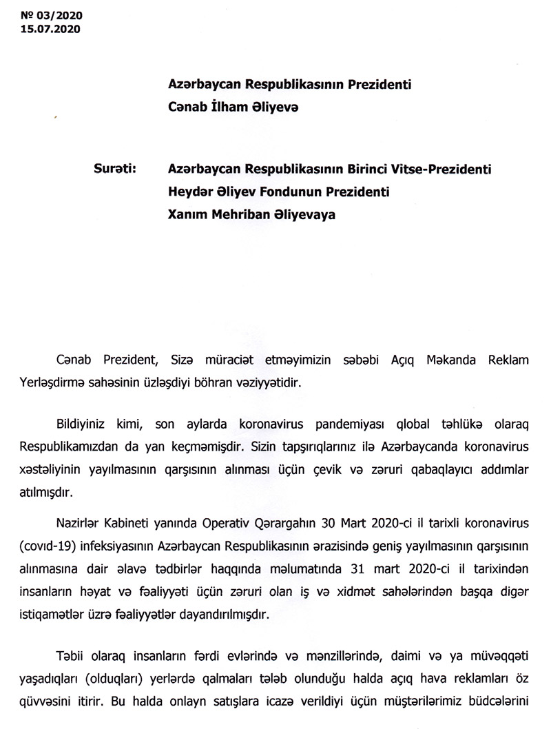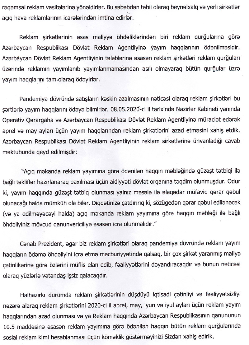 Azərbaycanda 20-dan çox reklam şirkəti pandemiya dövründə müştərilərinin açıq hava reklamlarının icarələrindən imtina etməsi səbəbi ilə reklam şirkətlərinin 2020-ci il aprel, may, iyun və iyul ayları üçün rüsum va yayım haqqlarından azad olunması üçün Azərbaycan Prezidenti İlham Əliyevə müraciət ediblər.