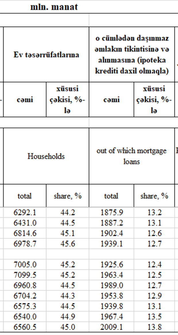 İyulda ev təsərrüfatlarına verilən kreditlərin xüsusi çəkisi 44,9%-dən 45%-ə yüksəlib.