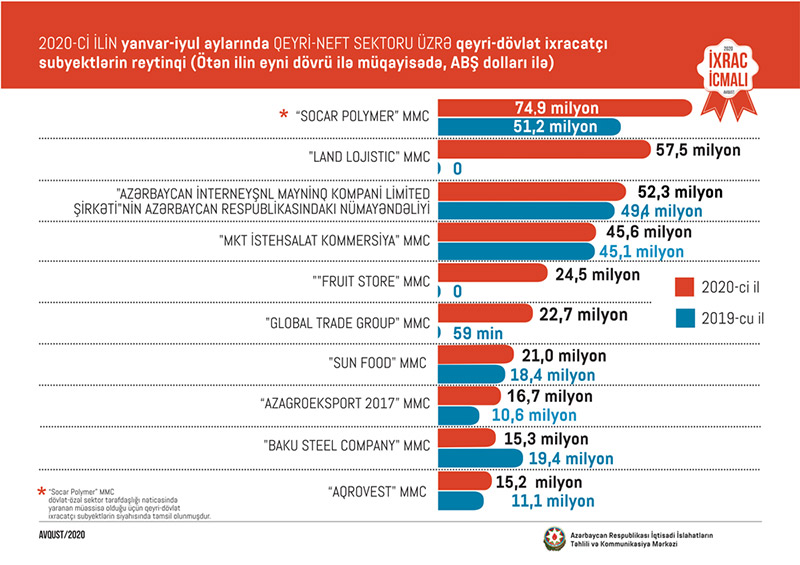 İcmalda verilən məlumata görə, “Baku Steel Company” MMC bu ilin yanvar-iyul ayları ərzində 15,3 milyon ABŞ dolları dəyərində məhsullar ixrac edib ki, bu da keçən ilin müvafiq dövrü ilə müqayisədə 21,1% azdır.