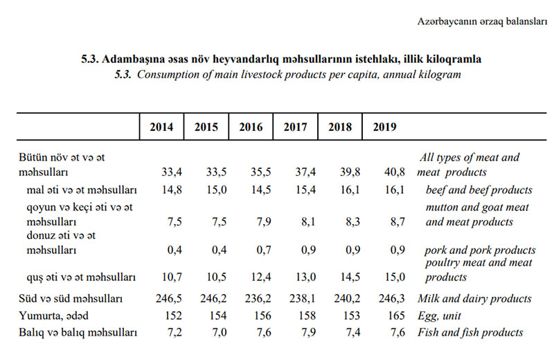 Son 5 ildə adambaşına süd və süd məhsulları istehlakı demək olar ki dəyişməyib, illik 246,3 kq təşkil edib. Adambaşına illik yumurta istehlakı 13 ədəd artaraq 165 ədəd, balıq və balıq məhsulları istehlakı 0,4 kq artaraq 7,6 kq təşkil edib.