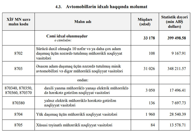 Cari ilin 8 ayında ayda ölkəmizə 31 min 26 ədəd minik avtomobili, 108 ədəd avtobus, 1 960 ədəd yük avtomobili və 84 ədəd xüsusi təyinatlı avtomobil idxal edilib.