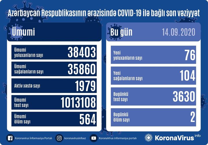 Azərbaycanda indiyədək ümumilikdə 38 min 403 nəfər koronavirus infeksiyasına yoluxub. Onlardan 35 min 860 nəfər müalicə olunaraq sağalıb, 564 nəfər vəfat edib, aktiv xəstə sayı 1979 nəfərdir.