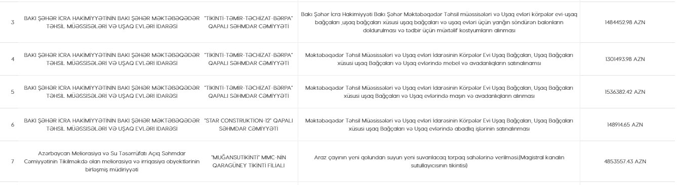 Vahid dövlət satınalmaları portalında məlumat verilir ki, tenderlərin qalibi "Tikinti-Təmir-Təchizat-Bərpa" QSC-dir.