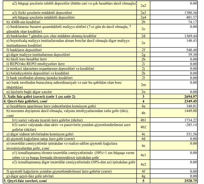 2017-ci ilin yanvar Mart dövründə Bankın faiz gəlirləri 6 milyon 648 manat, qeyri-faiz gəlirləri 2 milyon 349 min manat təşkil edib. Ötən ilin anoloji dövründə bankın faiz gəlirləri 4 milyon 785 min manat, qeyri-faiz gəlirləri isə 1 milyon 940 min manat təşkil etmişdi.
