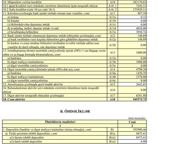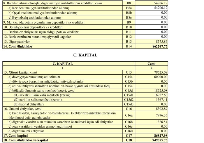 Bu ilin ilk rübündə 2 milyon 515 min manat əməliyyat mənfəətinin 575.92 min manatı aktivlər üzrə mümkün zərərlərin ödənilməsi üçün xüsusi ehtiyatın yaradılmasına ayırılıb. Ötən ilin ilk rübündə Bankın 2 milyon 659 min manat əməliyyat mənfəətinin üzərinə ehtiyatlardan azad edilmiş 568.57 min manat əlavə edilmişdi. Əsasən bu səbəbdən ötən ilin birinci rübündə bankın xalis mənfəəti yüksək olmuşdu.