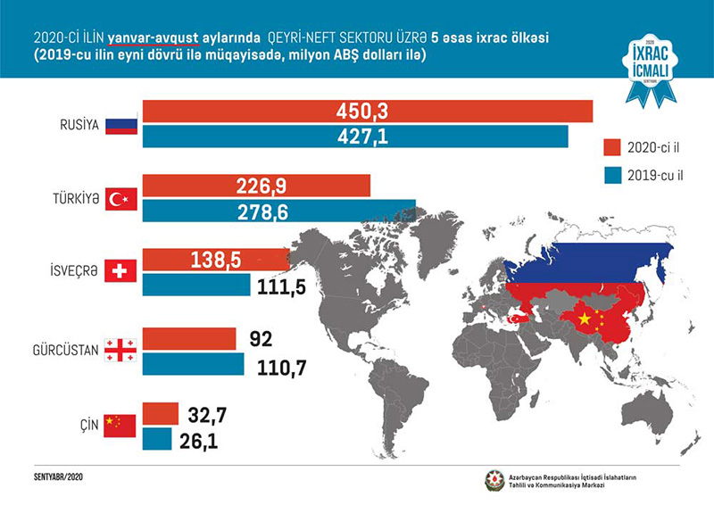 Bu ilin yanvar-avqust ayları ərzində Rusiyaya 450,3 milyon, Türkiyəyə 226,9 milyon, İsveçrəyə 138,5 milyon, Gürcüstana 92 milyon və Çinə 32,7 milyon ABŞ dolları dəyərində qeyri-neft sektoruna aid mal ixrac olunub.
