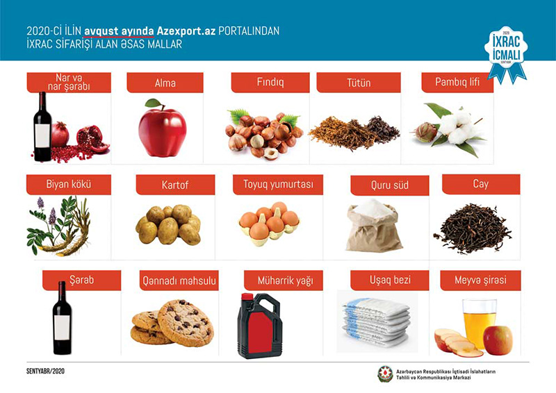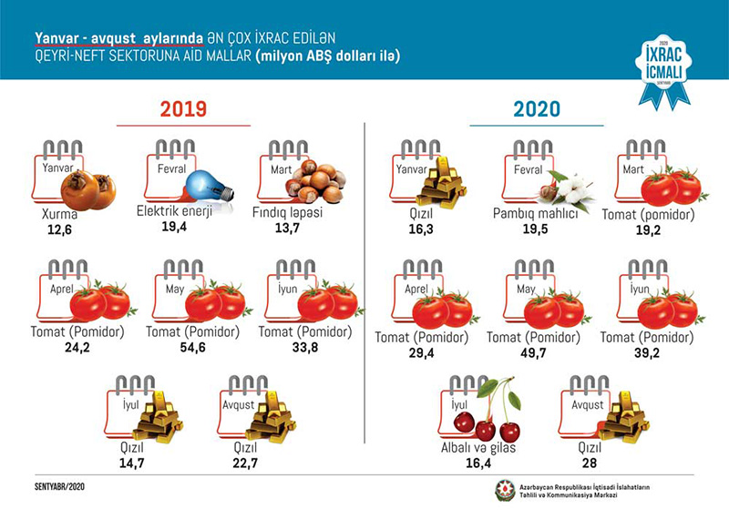2020-ci ilin yanvar-avqust ayları ərzində ixrac edilən qeyri-neft sektoruna aid malların siyahısında pomidor (167 milyon ABŞ dolları) birinci, qızıl (sikkə kəsilməsində istifadə olunmayan, digər emal olunmamış formalarda – 124,4 milyon ABŞ dolları) ikinci və pambıq mahlıcı (78,6 milyon ABŞ dolları) üçüncü olub.