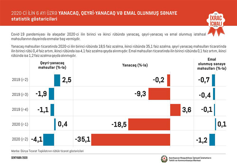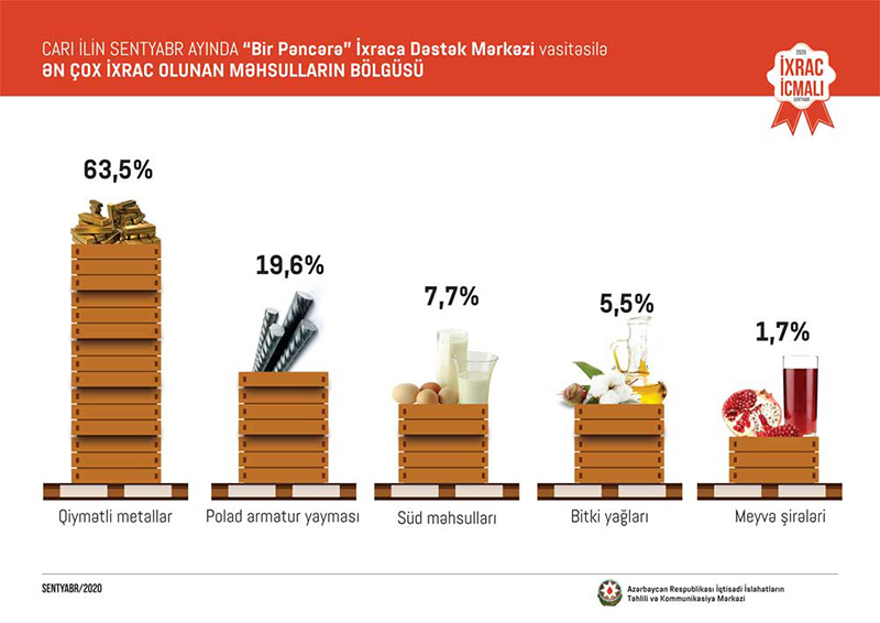 2020-ci ilin avqust ayında qeyri-neft sektoru üzrə ixracda qızıl (28 milyon) birinci, pambıq mahlıcı (6 milyon ABŞ dolları) ikinci, emal olunmamış aşqarlanmamış alüminium – (5,4 milyon ABŞ dolları ) üçüncü yerdə qərarlaşıb.