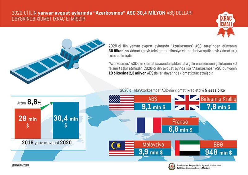 2020-ci ilin yanvar-avqust aylarında “Azərkosmos” ASC tərəfindən dünyanın 30 ölkəsinə 30,4 milyon ABŞ dolları xidmət (peyk telekommunikasiya xidmətləri və optik peyk xidmətləri) ixrac edilib ki, ötən ilin müvafiq dövrü ilə müqayisədə 8,6 faiz artım deməkdir.