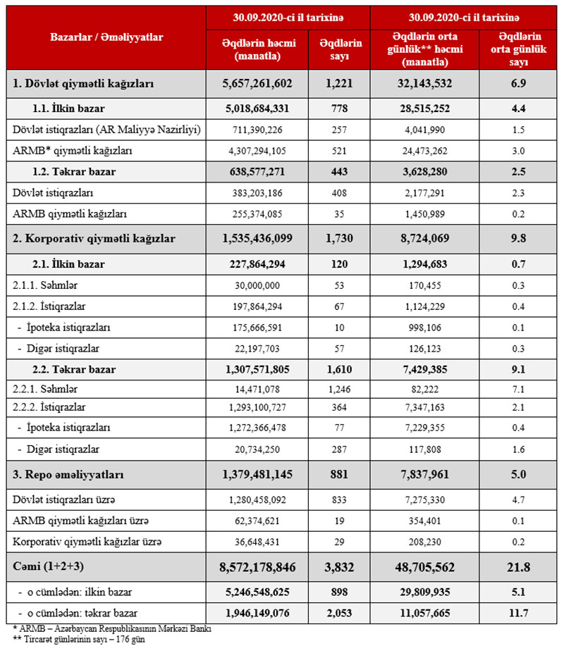 “2020-ci ilin yanvar-sentyabr ayları ərzində ümumi təkrar bazar üzrə ticarət həcmində 42%, korporativ qiymətli kağızlar bazarı üzrə 81%, repo əməliyyatları üzrə isə 64%, səhmlər üzrə ilkin bazarda 100 misli, səhmlər üzrə təkrar bazarında isə 8.5 misli qədər böyümə qeydə alınmışdır.