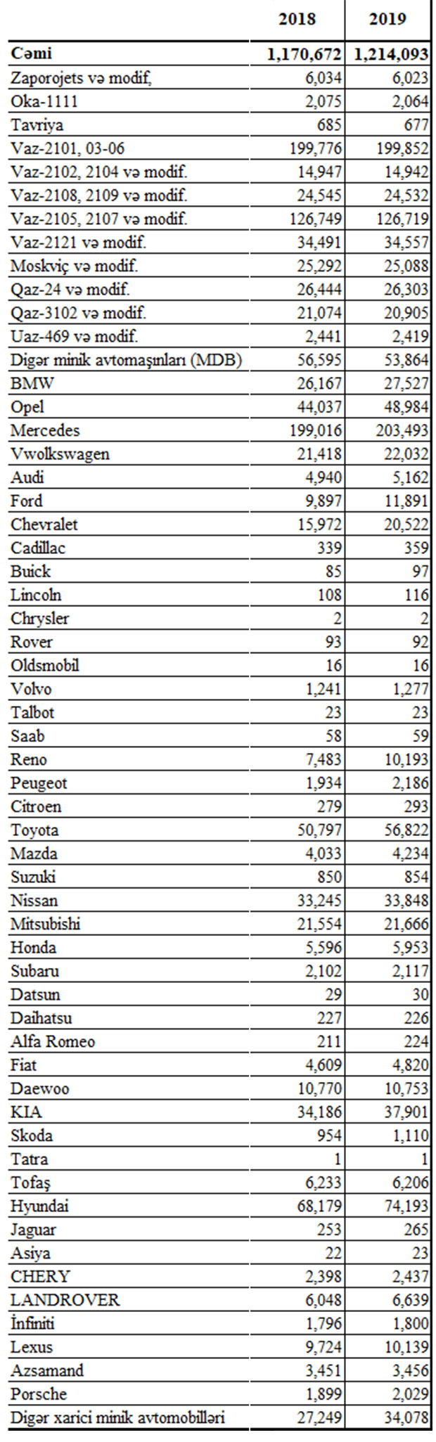 2019-cu ildə Azərbaycanda qeydiyyatda olan avtomobillərin sayı 43 min 421 ədəd artaraq 1 milyon 214 min 93 ədədə çatıb.
