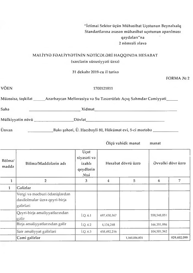 Ötən ili “Azərbaycan Meliorasiya və Su Təsərrüfatı”nın gəlirləri 1 milyard 160 milyon 57 min manat (əvvəlki illə müqayisədə 39,9% çox), xərcləri isə 833 milyon 947 min manat (3,15% az) təşkil edib. Şirkət mənfəət vergisi ödəməyib.