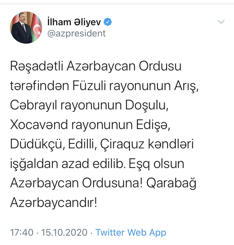Daha 6 kənd işğaldan azad edilib."Rəşadətli Azərbaycan Ordusu tərəfindən Füzuli rayonunun Arış, Cəbrayıl rayonunun Doşulu, Xocavənd rayonunun Edişə, Düdükçü, Edilli, Çiraquz kəndləri işğaldan azad edilib. Eşq olsun Azərbaycan Ordusuna! Qarabağ Azərbaycandır!", - Marja xəbər verir ki, Azərbaycan Prezidenti İlham Əliyev Twiter səhifəsində yazıb.
