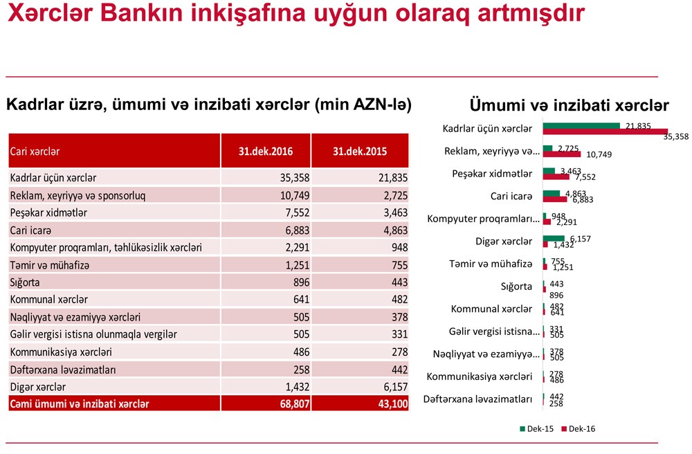 Bankın xərcləri arasında ən böyük yeri “kadrlar üçün xərclər”, “reklam , xeyriyyəçilik və sponsorluq” xərcləri tutur. 2015-ci ildə kadrlar üzrə xərclər 21 milyon 835 min manat ikən, ötən il 35 milyon 358 min manata qalxıb.